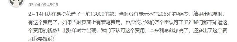 另一用户表示,其在借款时,对所谓的担保费完全不知情。“2月14日我在易得花借了13000元,当时没有显示还有2065元的担保费,结果出账单时,有这个费用了,如果当时页面上有这笔费用,也应该让我签个字认可吧?我都不知道这个费用的钱数,本来利息就够高了,还多出了这个费用!”