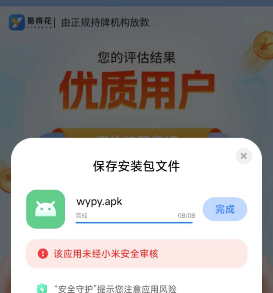 柒财经发现,在小米手机商城上,搜不到易得花的APP,想要下载,需要通过易得花微信公众号的应用链接,而下载时小米手机会提示,该应用未经小米安全审核。天眼查显示,易得花的运营方为深圳市国丰非融资性担保有限公司,该公司成立于2018年,曾用名国丰盛世非融资性担保 (深圳)有限公司 ,法定代表人为肖映熙。经营范围显示,该公司投资兴办实业(具体项目另行申报);从事担保业务(不含融资性担保);互联网技术的技术开发等。