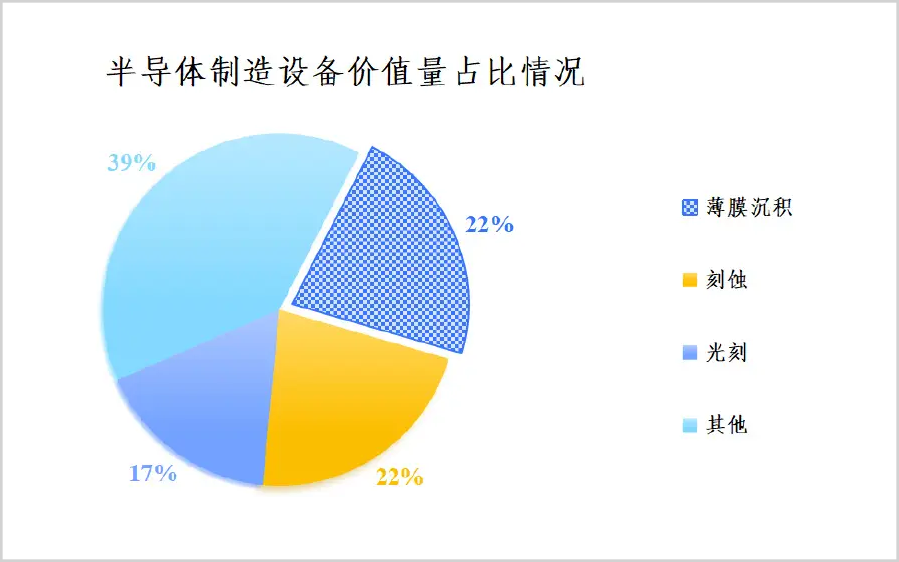 进一步拆分晶圆制造设备,又可分为薄膜沉积、光刻、刻蚀等三大部分。现在人人都知道光刻机,其实光刻环节的价值占比并没有薄膜薄膜沉积和刻蚀高。数据显示,光刻设备占半导体设备总价值的比重是17%,而薄膜沉积设备和刻蚀设备的占比均达到22%。