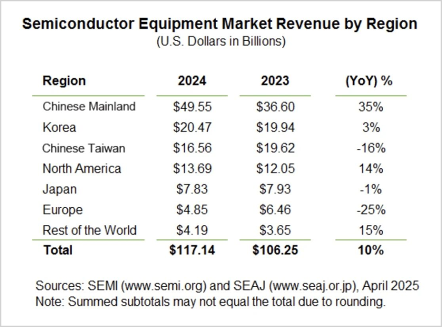 根据SEMI数据,2024年全球半导体设备市场规模达到1170亿美元,同比增长10%,其中中国大陆设备支出达到495亿美元,同比增长35%,在全球市场中的占比高达42.3%。