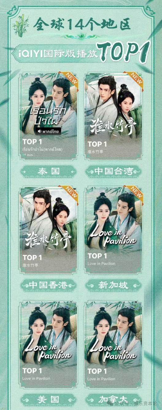 古韵十足的东方美学还火到海外。首播后,《淮水竹亭》很快登顶美国、新加坡、加拿大、韩国等全球14个地区iQIYI国际版播放TOP1。线下,马来西亚吉隆坡柏威年商场举办“淮水竹亭竹园古装体验打卡”活动。加更礼收官当天,主创远赴新加坡参加见面会,同日,爱奇艺官宣刘诗诗为全球大使,再度印证《淮水竹亭》强大的海外影响力。