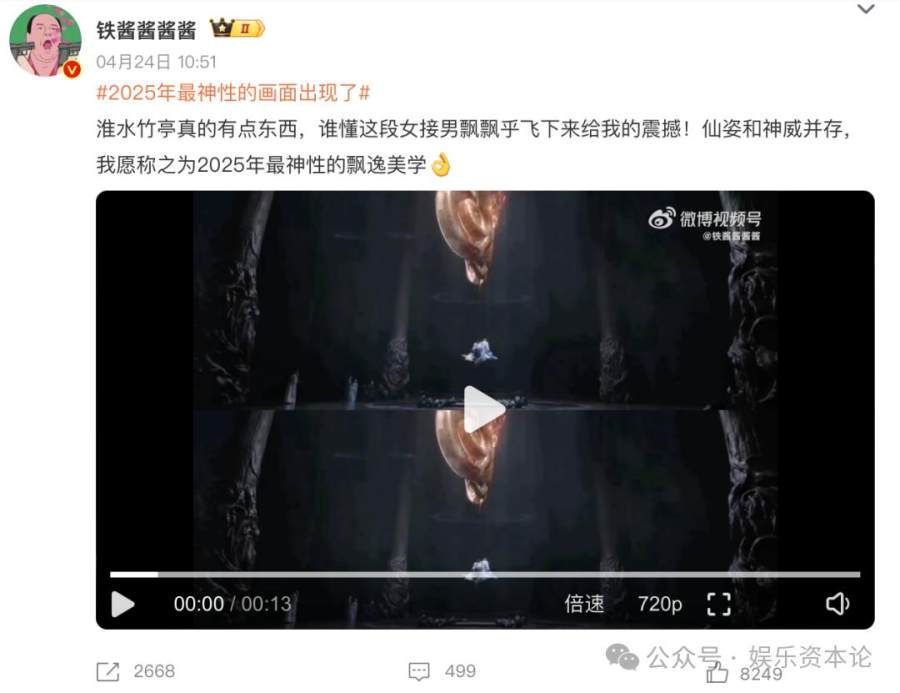 而仙侠剧最具想象力的特效场面,既满足视觉冲击,又服务于情感表达,比如“天地一剑”的燃爽、“妖丹化雪”的唯美、“以命燃剑”的大义。同时,《淮水竹亭》的特效通常以克制的方式,在纯净背景下创造出有记忆点的画面。剧播期间。特效团队之一艺匠曾在社交媒体上分享特效解析,这个团队之前还参与过《哪吒》《流浪地球》系列视效制作。弘业以命开伞唤醒淮竹,淮竹抱着弘业从天而降缓缓落下,这个被观众称为“2025年最神性的画面”正是出自他们之手。