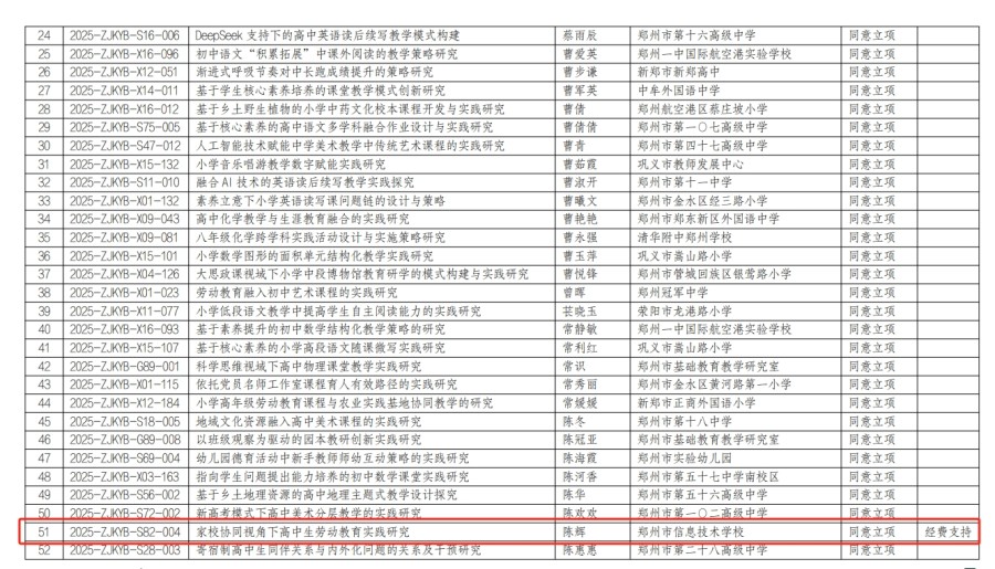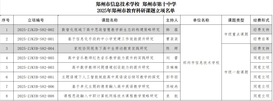 5月15日获悉,郑州市教育局公布的2025年度郑州市教育科学重大课题、重点课题、一般课题立项名单中,郑州市信息技术学校有8项课题成功获批立项,其中市级重点课题2项、市级一般课题6项。