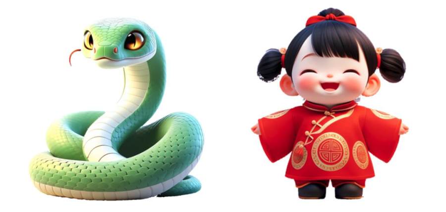 提示词:在一个欢乐而充满节日气氛的场景中,穿着鲜艳红色春服的小女孩正与她的可爱卡通蛇嬉戏。她的春服上绣着金色吉祥图案,散发着喜庆的气息,脸上洋溢着灿烂的笑容。蛇身呈现出亮眼的绿色,形状圆润,宽大的眼睛让它显得既友善又幽默。小女孩欢快地用手轻轻抚摸着蛇的头部,共同享受着这温馨的时刻。周围五彩斑斓的灯笼和彩带装饰着环境,阳光透过洒在她们身上,营造出一个充满友爱与幸福的新年氛围。