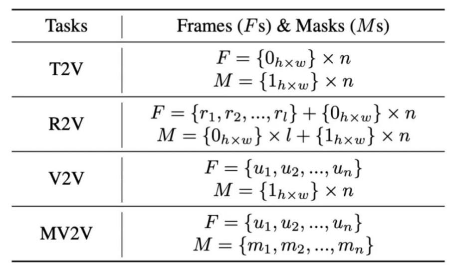 VCU 用统一的表示方式,将以上四类任务的输入都表示为相同的三元组形式 ( T,F,M ) ,T 为文本提示,F 为参考图像或上下文帧,M 为 mask:
