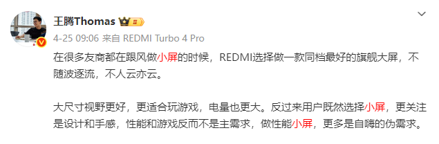 这一次隔空喊话,直接将小屏手机的话题推上了风口浪尖。根据王腾的微博,他不仅直言“友商跟风做小屏手机”,还把主打性能小屏的手机贴上了“伪需求”的标签,而Redmi坚持大屏路线,是因为大屏“视野好、续航强、更适合玩游戏”。