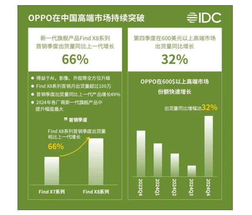 2024年,X8系列凭借千里长焦技术等功能,首销即大卖,出货量相比上一代提升超过60%,成为各厂商新一代旗舰产品中提升幅度最大的产品,直接带动OPPO 4K以上价位段机型在Q4季度出货量同比大增32%,直至今年Q1,OPPO Find X8系列持续畅销。