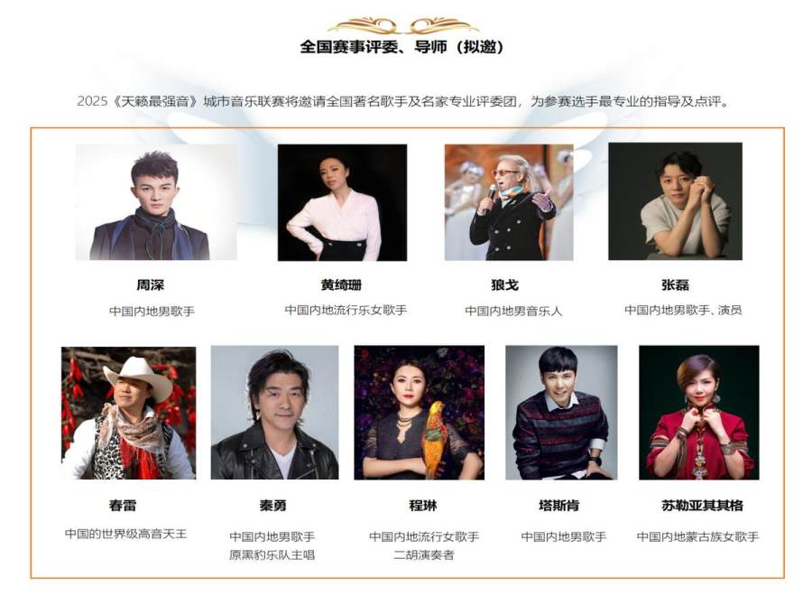 作为CCTVColourfulPlanet,七彩星球电视栏目《爱在天地间》活动组委会指导的全国赛事,2025《天籁最强音》城市音乐联赛邀请全国电视节目主持人冯勇、梁慧敏担任主持,并拟邀周深、黄绮珊、程琳、狼戈、秦勇、春雷、张磊、塔斯肯、苏勒亚其其格 等数位国内知名歌手及艺术名家组成专业评审团,为参赛者提供现场指导与点评。赛事秉持“公平、公开、公正”原则,全程零报名费,向全国所有音乐爱好者开放报名通道,覆盖年龄段16-60岁的素人群体,不限风格和演唱形式,致力于挖掘“藏在民间的天籁之声”。