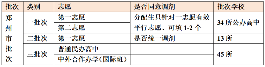 中招志愿分为:河南省提前批次、郑州市批次,每一批次又分不同的小批次