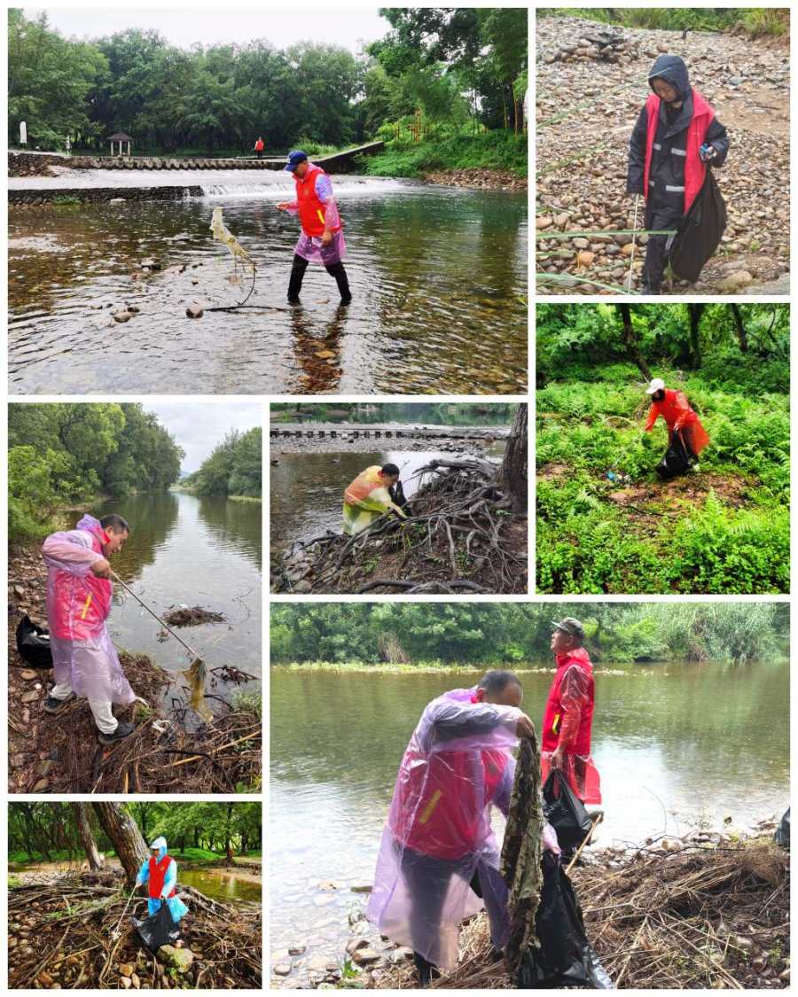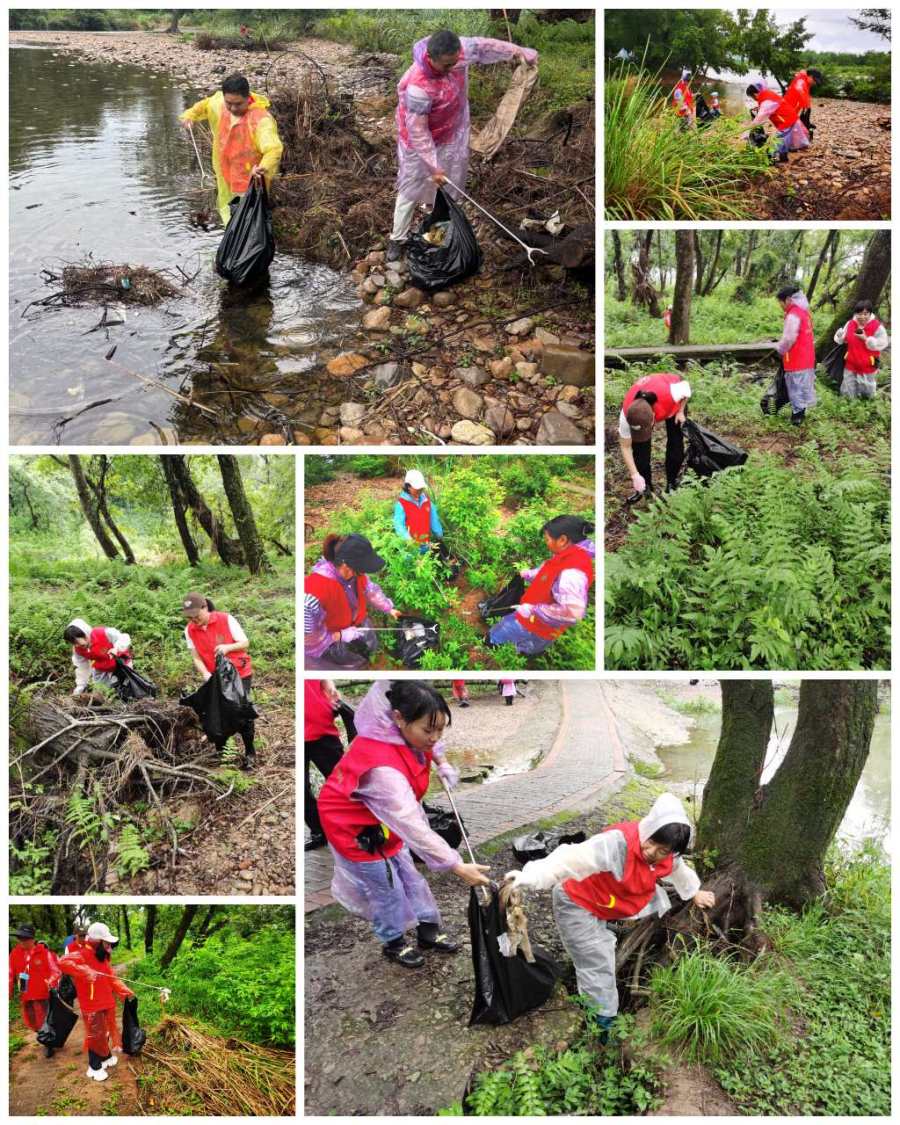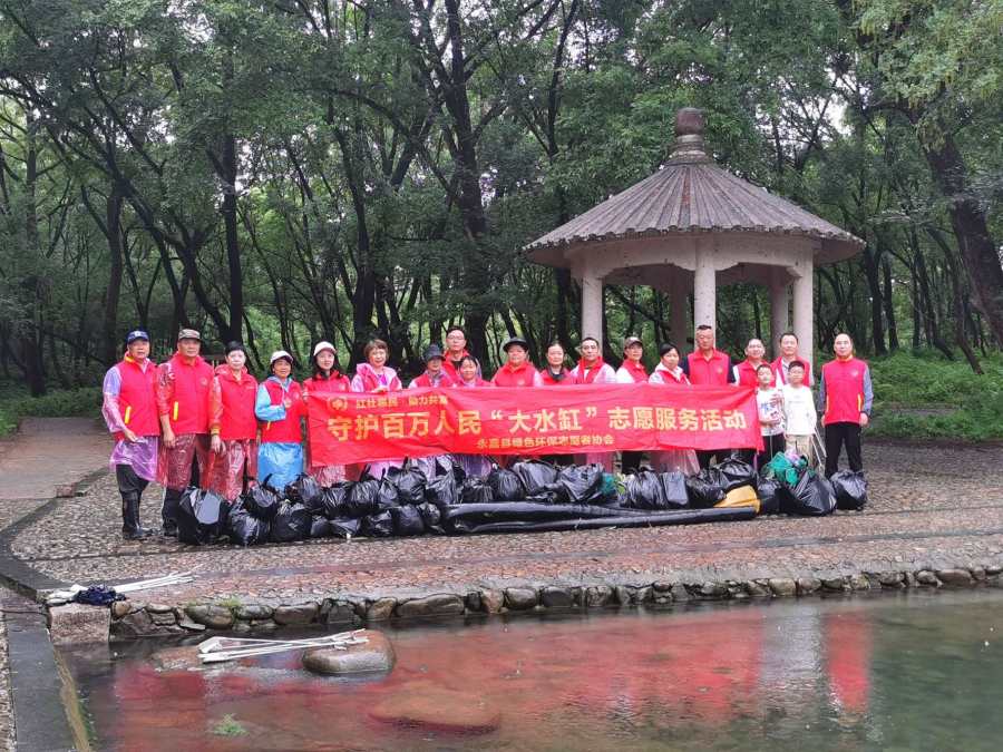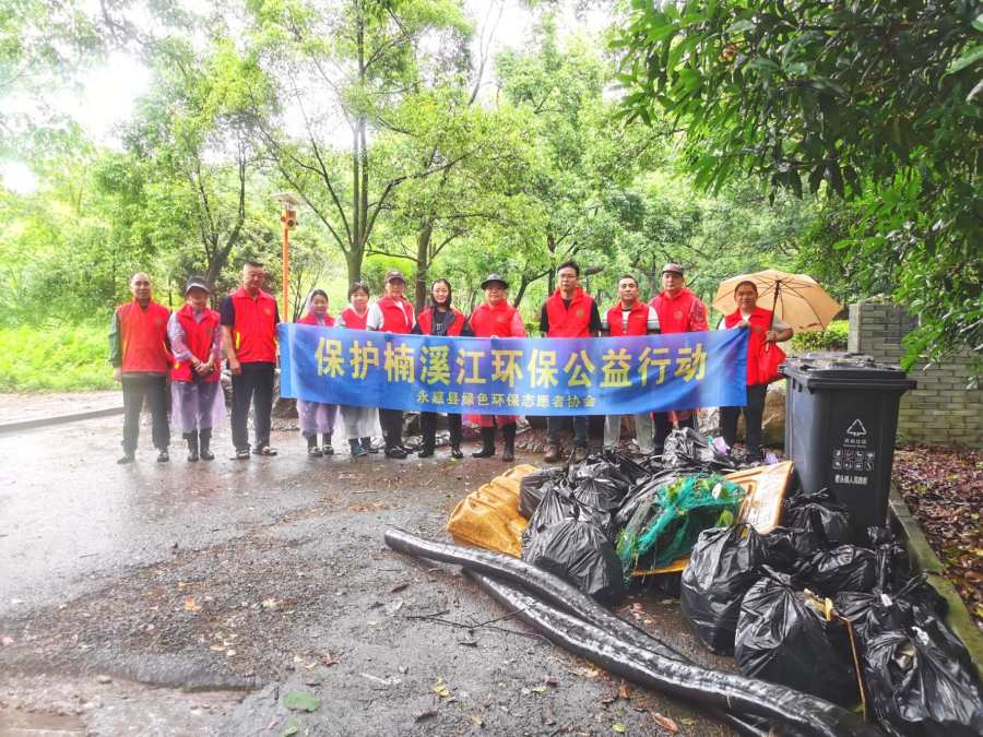 ——浙江永嘉县绿色环保志愿者协会红蜻蜓服务队冒雨清理楠溪江垃圾