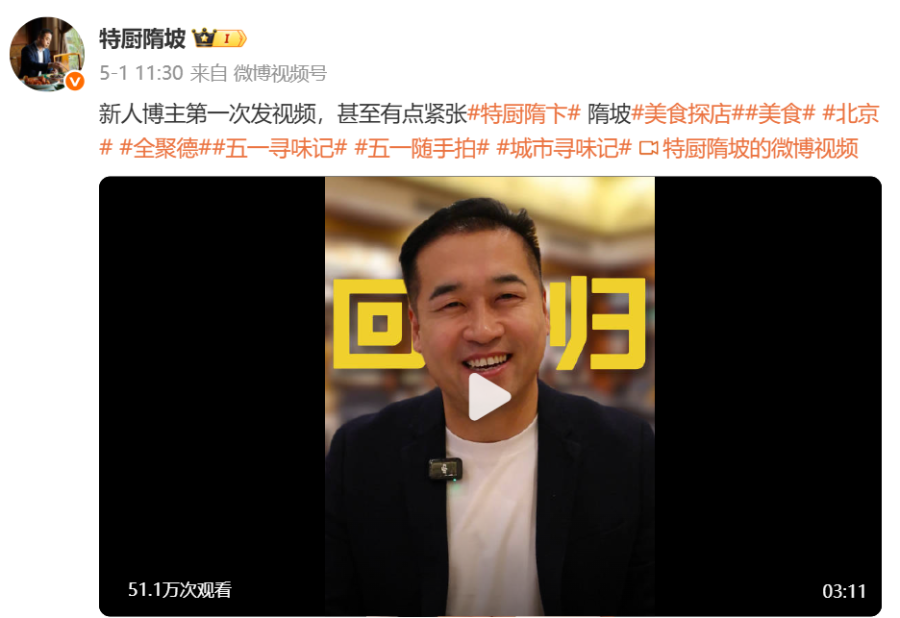 5月1日起,账号“特厨隋坡”开始在各大平台更新视频。