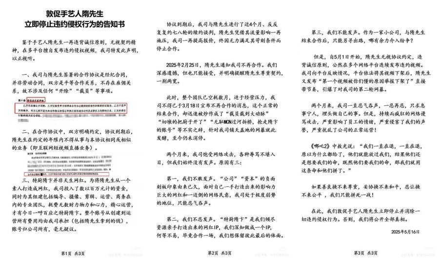 其中一则名为《敦促手艺人隋先生立即停止违约侵权行为 !》的视频晒出一则告知书,称和隋先生约定在协议到期后,隋先生在规定年限内不得从事与本协议相同或相似的业务(即互联网短视频直播业务),同时表示隋先生并非天生网红,供公司投入了数以百万计的资金包括编导、摄像剪辑、运营等在内的专业团队,所以账号归公司所有无异议。