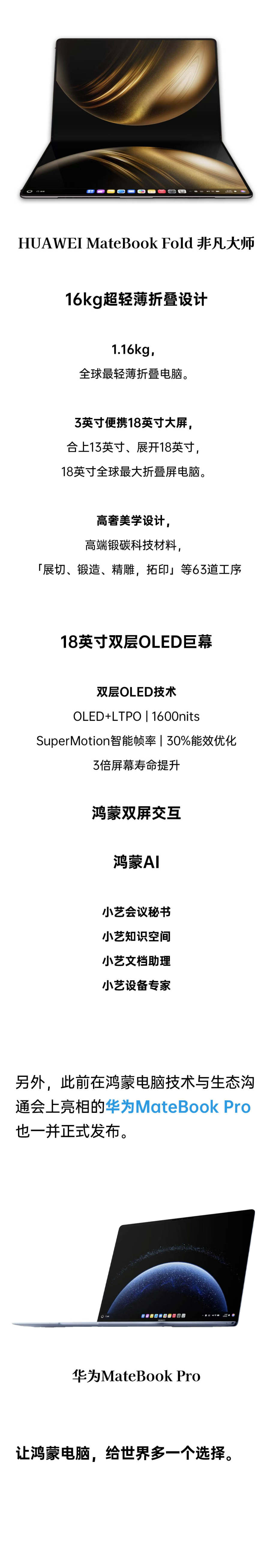 5月19日,nova 14系列及鸿蒙电脑新品发布会,华为发布首款鸿蒙折叠屏电脑——HUAWEI MateBook Fold 非凡大师,此前在鸿蒙电脑技术与生态沟通会上亮相的华为MateBook Pro也正式发布。