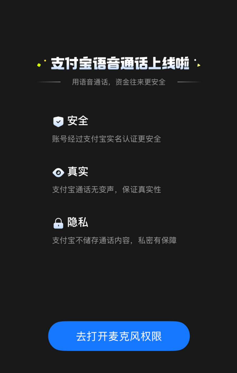 用户如首次使用语音通话,会看到一个新功能提示页面,显示的三条提醒分别为:账号经过支付宝实名认证更安全;通话中无变声,保证真实性,以及不储存通话内容,私密有保障。