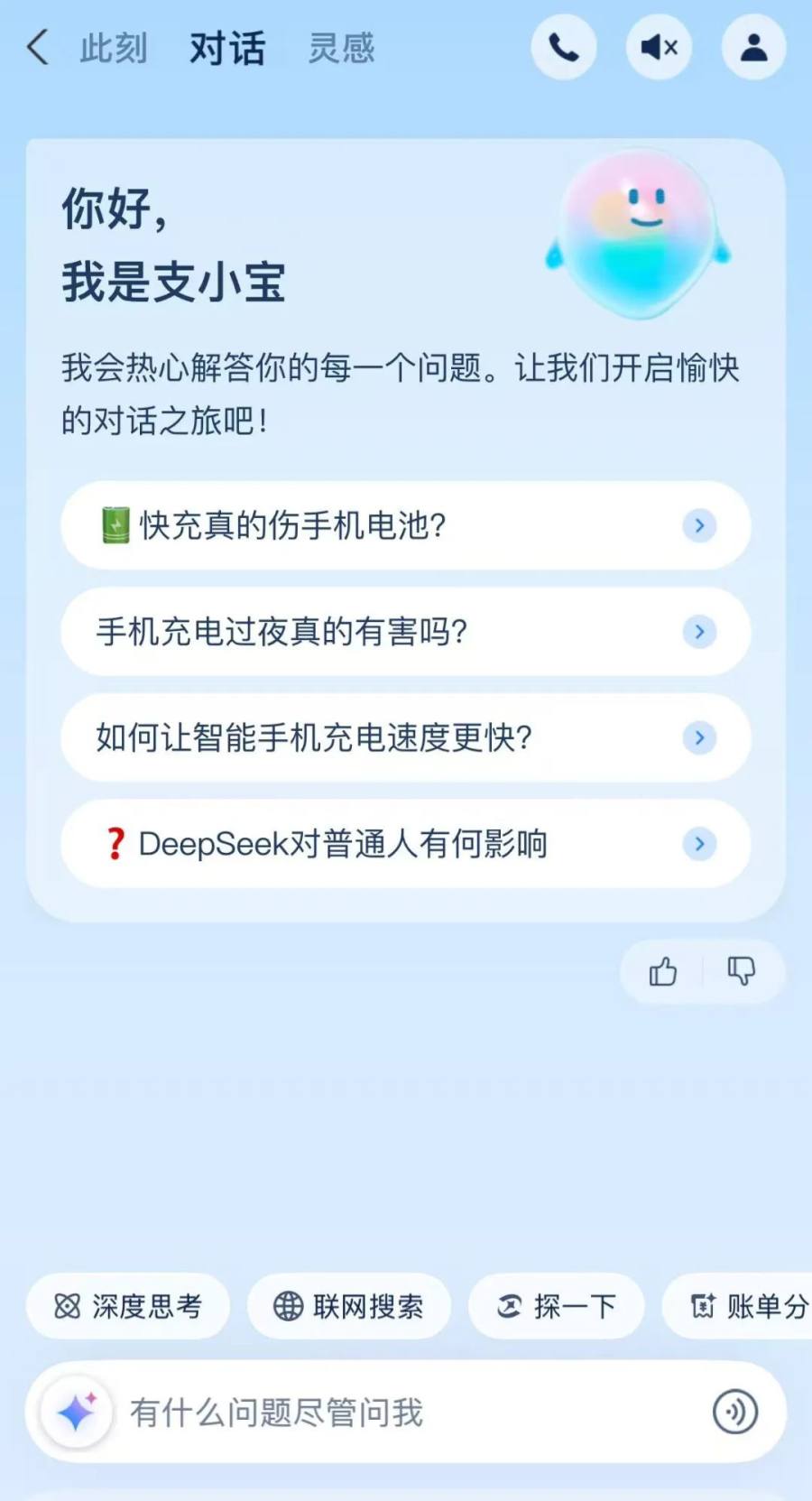 也是在去年,支付宝经过了近一年的预热推出了一款新的APP“支小宝”。这是一款服务型AI独立APP。支小宝主要有三个功能页面:此刻、对话和灵感。