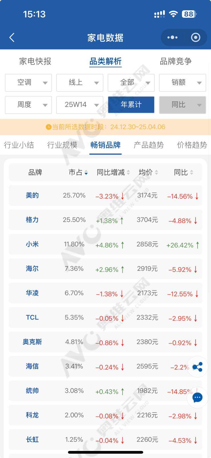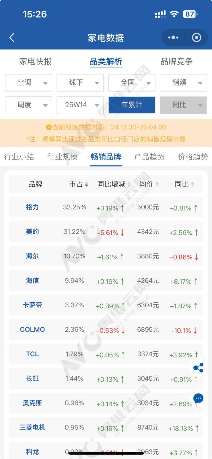 同样将时间段选在从以去年年末到截止到今年4月6日,数据显示,在平均价格同比上升3.81%的情形下, 格力市占率同比上升3.19%。美的平均价格同样有所上升,但市占率下滑了5.61%。前六名中,海尔、海信、卡萨帝(海尔)市占率分别上升了1.61%、0.19%、0.39%。