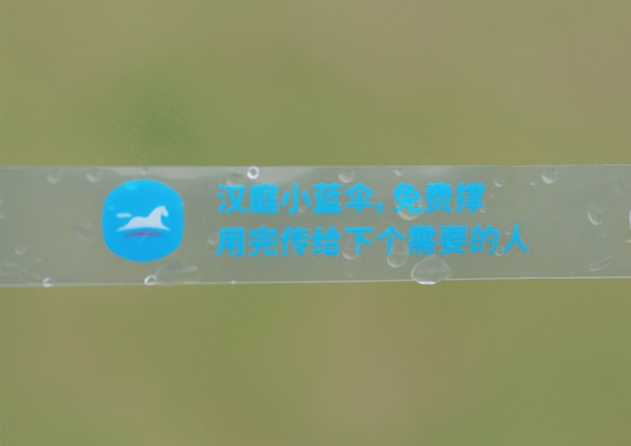 顺手借了汉庭大堂门口的透明雨伞,一打开才发现,伞带上印了两行醒目的蓝字:汉庭小蓝伞,免费撑,用完传给下个需要的人。