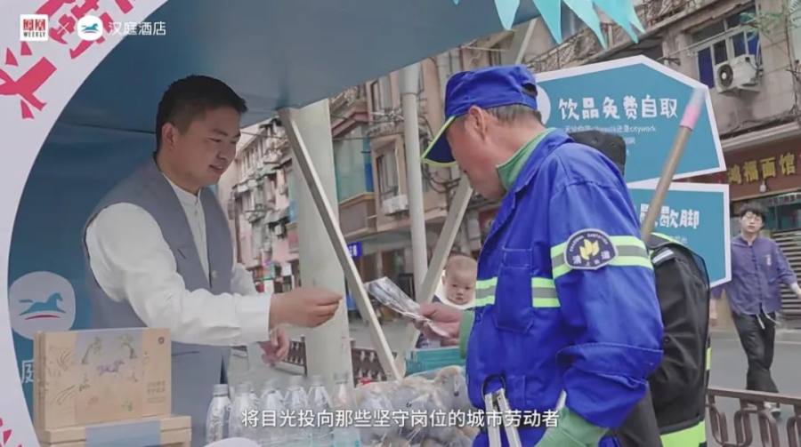 在上海街头巷尾的汉庭酒店门口支起「街头补给站」,免费发放矿泉水给城市劳动者和过路行人,希望用一瓶水的时间,换取劳动者们片刻的休息。
