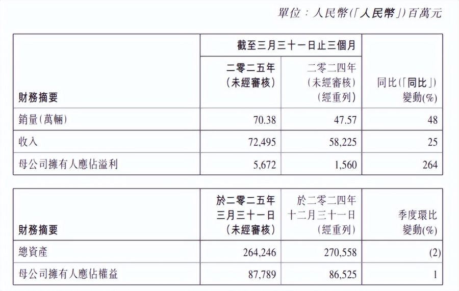 销量高增之下,2025Q1吉利汽车如期实现了强增长业绩:营收同比增长24.5%至725.0亿元;归母净利润为56.7亿元,增速在2024年213%的高点上再次攀高至263.6%,实现盈利持续大爆发。