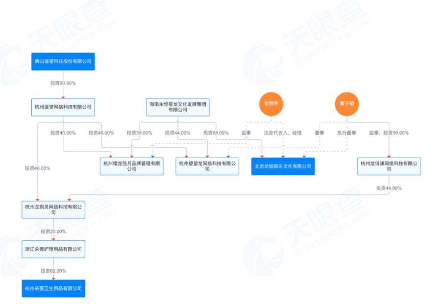 公开信息显示,朵薇卫生巾生产商浙江朵薇护理用品有限公司,成立于2021年,据股权穿透图显示,该公司的股东之一为杭州龙则灵网络科技有限公司,该公司大股东为由黄子韬持股99%的杭州龙悦谦网络科技有限公司,佛山遥望科技股份有限公司亦间接持股。