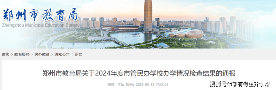 为进一步引导规范全市民办教育发展,根据《中华人民共和国民办教育促进法》《中华人民共和国民办教育促进法实施条例》,以及《郑州市教育局办公室关于开展2024年度市管民办学校办学情况检查工作的通知》(郑教民函〔2025〕13号)《郑州市教育局办公室关于强化党建引领做好2024年度市管民办学校办学情况实地检查工作的通知》(郑教民函〔2025〕50号)等文件要求,市教育局组织专家对市管民办学校2024年度办学情况进行了检查(以下简称年检),经研究,现将年检结果公布如下(排名不分先后):