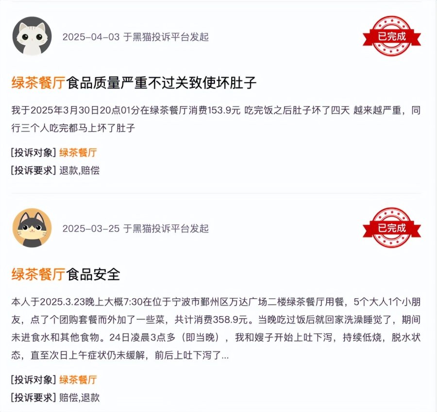 还有不少消费者在黑猫投诉平台上反馈,称绿茶餐厅存在食品安全问题,部分顾客表示用餐后出现身体不适。