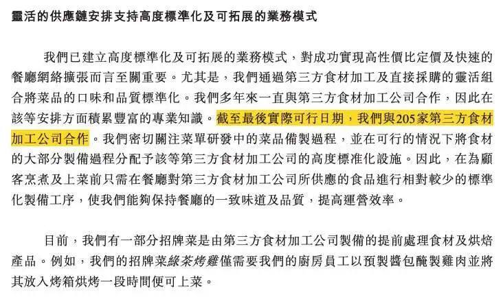 对预制菜,绿茶并不避讳。招股书中提到,绿茶餐厅内有一部分招牌菜是由第三方食材加工公司制备的预处理食材及烘焙产品,如“绿茶烤鸡”仅需简单烘烤即可上菜。目前已与205家第三方食材加工公司合作。