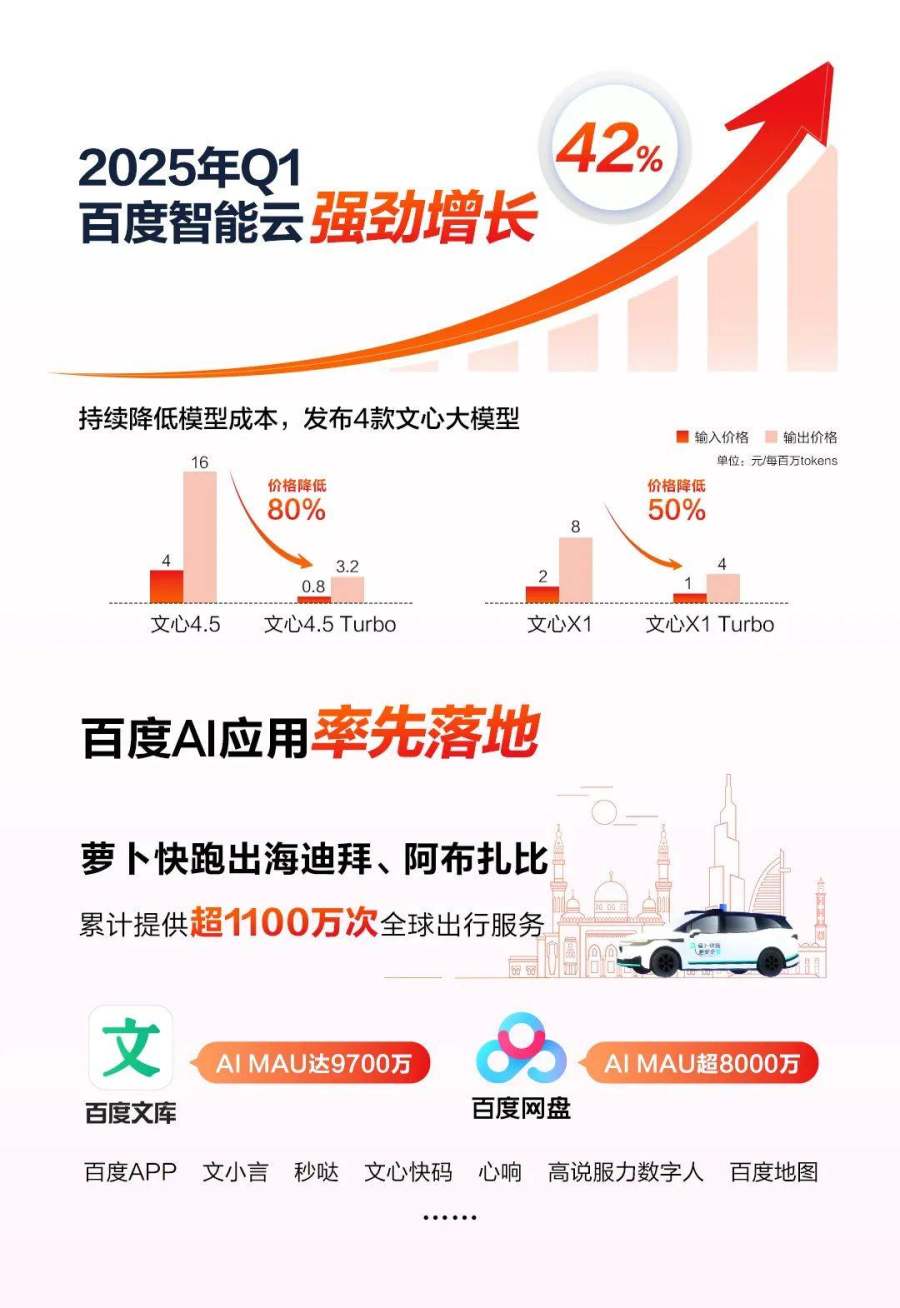 作为早早布局AI云的企业,百度智能云的表现尤为亮眼,一季度同比增速达42%。相比于Google的28%、微软的20%、阿里的18%,势头颇猛。