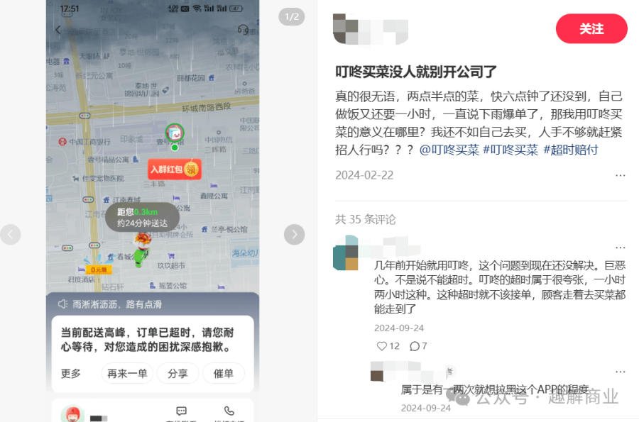 履约效率的提升势必会给骑手带来压力。2022年有媒体报道,叮咚买菜减少了各站点的骑手数量。“趣解商业”注意到,最近一年,时常有叮咚的骑手在社交平台上吐槽,在叮咚干“性价比不高”,送同一个地址两单只算一单的价格。也时常有消费者在小红书上吐槽,叮咚买菜的配送“超时”非常夸张,遇到恶劣天气APP常常会爆单,但“叮咚买菜的超时,经常会延长一到两个小时,非常夸张。”