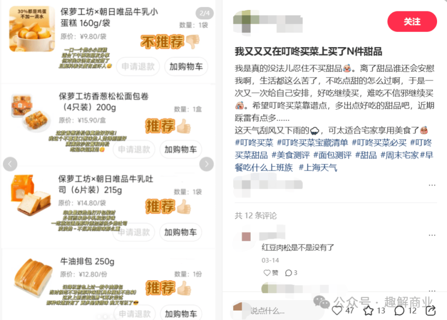 据不完全统计,叮咚买菜的自营品牌已经覆盖肉蛋奶、谷物,等多种食品,其中也包括毛利50%以上的烘焙赛道。“趣解商业”注意到,叮咚买菜的甜品糕点产品在社交平台上好评颇多,除了榴莲千层、瑞士卷等网红款,也有“酸奶夹”“脆墩墩”等独家的特色甜品。