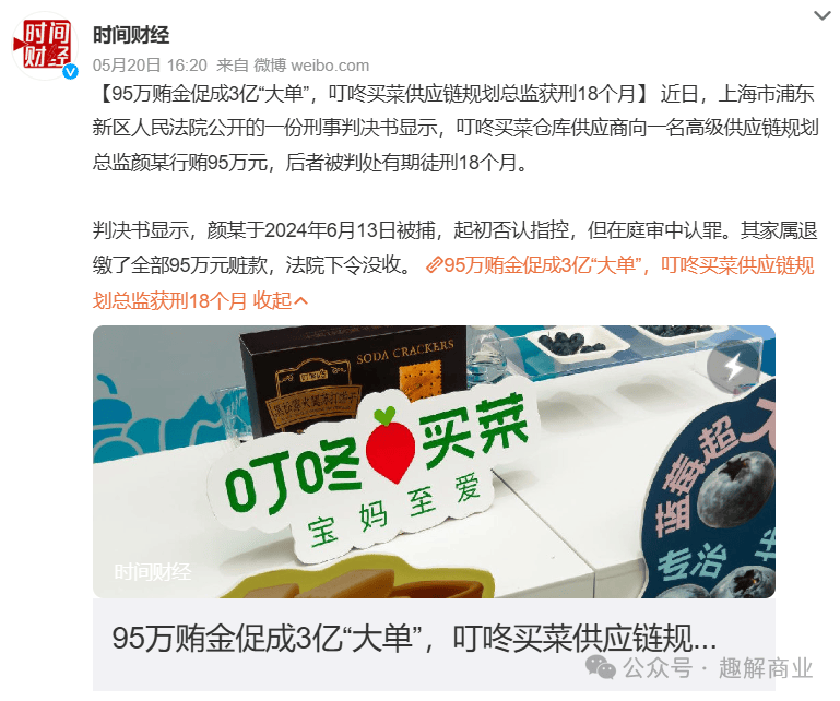 “趣解商业”注意到,不止叮咚买菜,盒马、美团小象等多家零售商的采购或物流负责人都出现过利用职务之便收取合作商好处的舞弊事件。供应链涉及多方合作,零售企业想要坚守长期主义,内部恐怕要构建起更完善的监督机制。