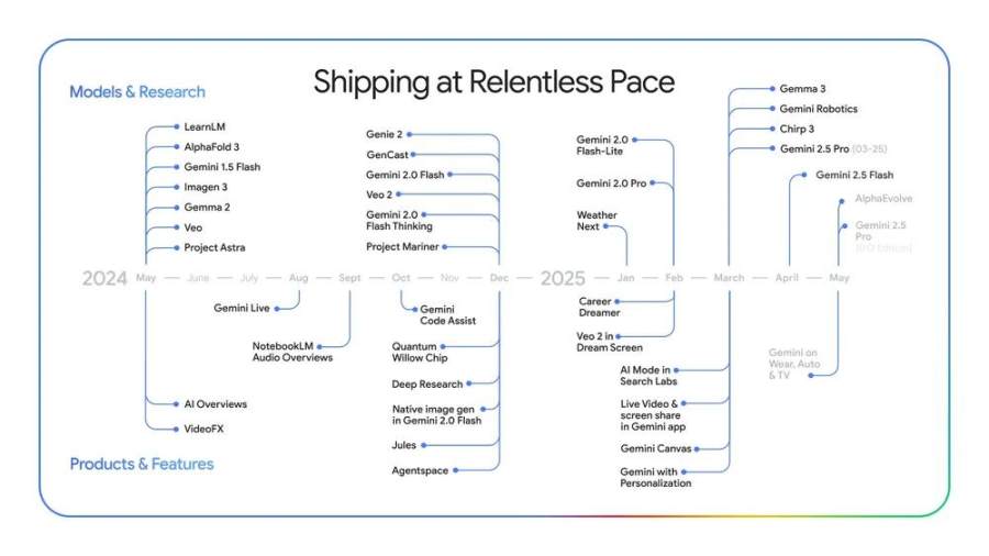 谷歌 CEO Sundar Pichai 在 Google I/O 2025 中表示,“ 在 Gemini 时代,我们很可能会在三月的某个周二发布我们最智能的模型,或者提前一周宣布像 AlphaEvolve 这样的酷炫突破。我们的发布速度比以往任何时候都快。”
