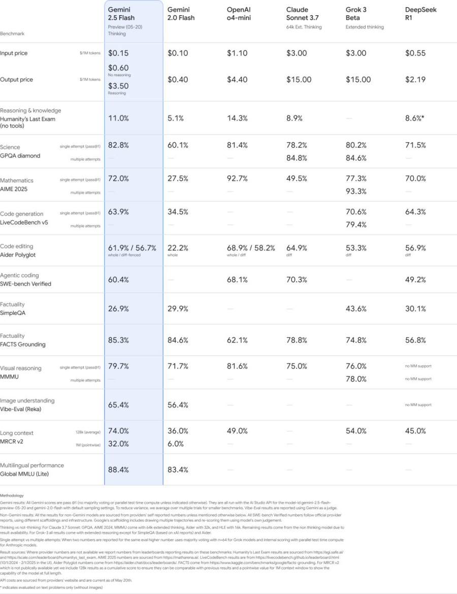 Gemini 2.5 Flash 则继续主打速度和低成本,综合来看,其成本目前和 DeepSeek R1 大致在同一个水平。