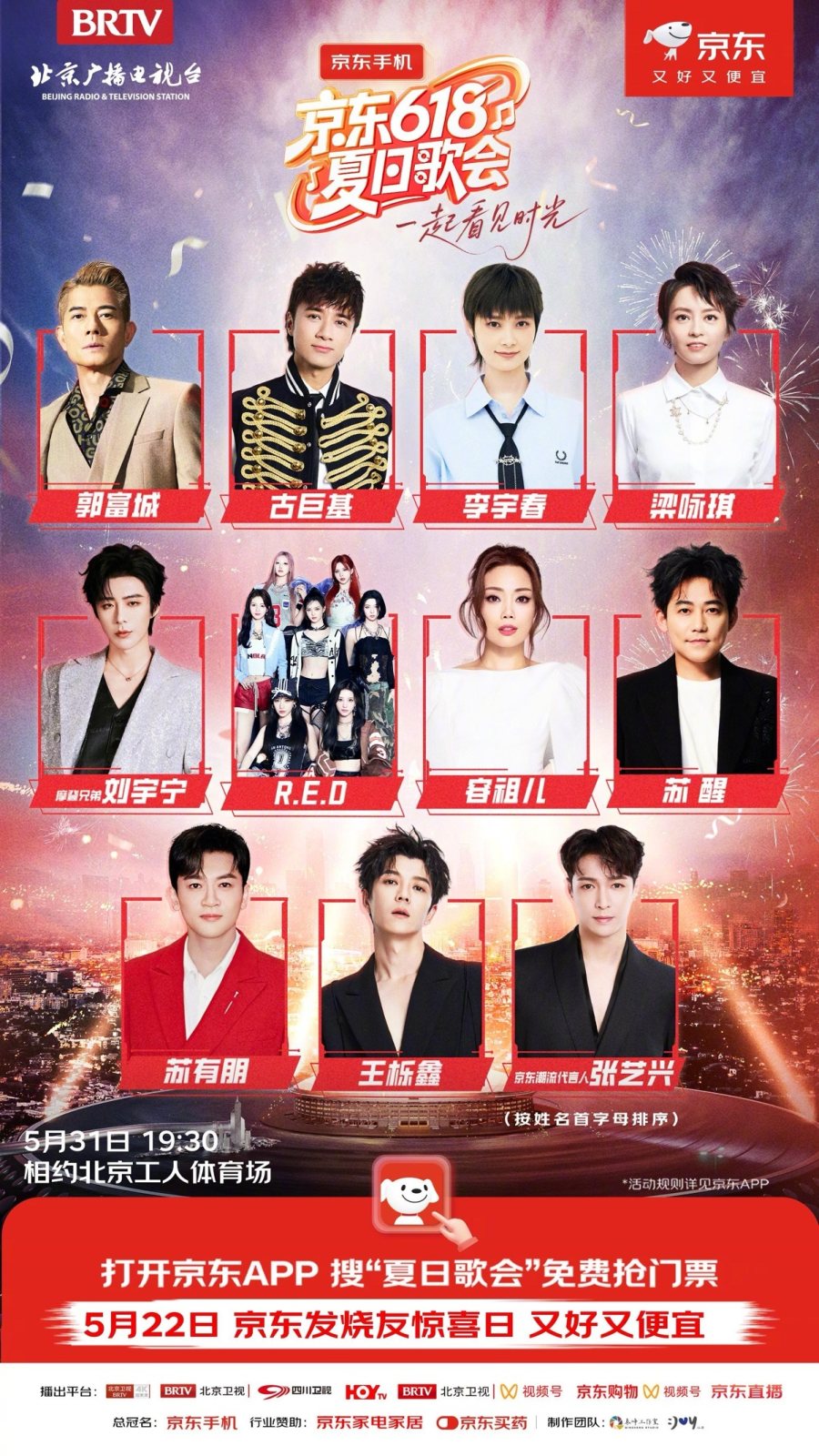 雷达财经讯 5月22日,由京东和北京广播电视台联合主办的京东618夏日歌会正式官宣演唱会明星阵容,郭富城、古巨基、李宇春、梁咏琪、刘宇宁、R.E.D、容祖儿、苏醒、苏有朋、王栎鑫、张艺兴(按艺人首字母排序)会在此次歌会中惊喜亮相,并带来精彩表演。