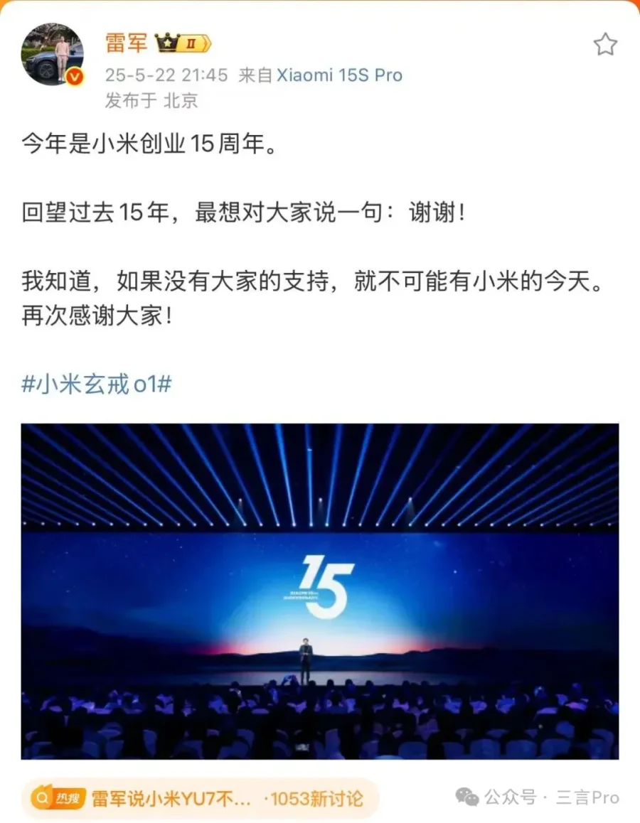 今晚,小米举办15周年新品发布会。三言Pro在现场的感受是,以往在发布会上饱含激情的雷军回来了,还是熟悉的口音,熟悉的节奏。