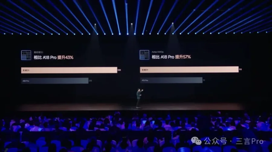 此外,玄戒O1的GPU采用Arm Immortalis-G925 16核图形处理器,曼哈顿 3.1测试达到330帧、Aztec 1440p测试达到110帧,大幅度领先苹果A18 Pro,同性能下功耗相比A18 Pro低35%;此外,主流MOBA游戏帧率高1.5fps,温度低3.2°。
