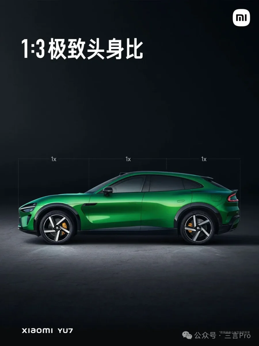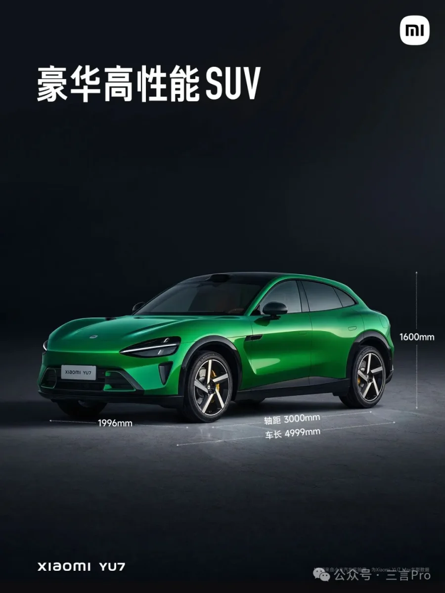 小米YU7定位“豪华高性能SUV”,车长4999mm,宽1996mm,高1600mm,轴距3000mm。