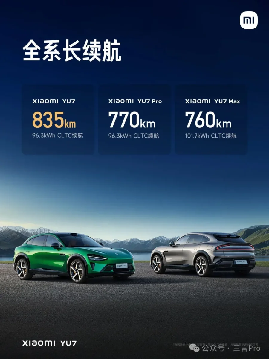 续航方面,小米YU7共有YU7、YU7 Pro和YU7 Max三个版本。其中,YU7 CLTC续航835km;YU7 Pro CLTC续航770km;YU 7 Max 760km。全系搭载800V碳化硅高压平台,15分钟最快补能620km,10%-80%最快充电时间12分钟。