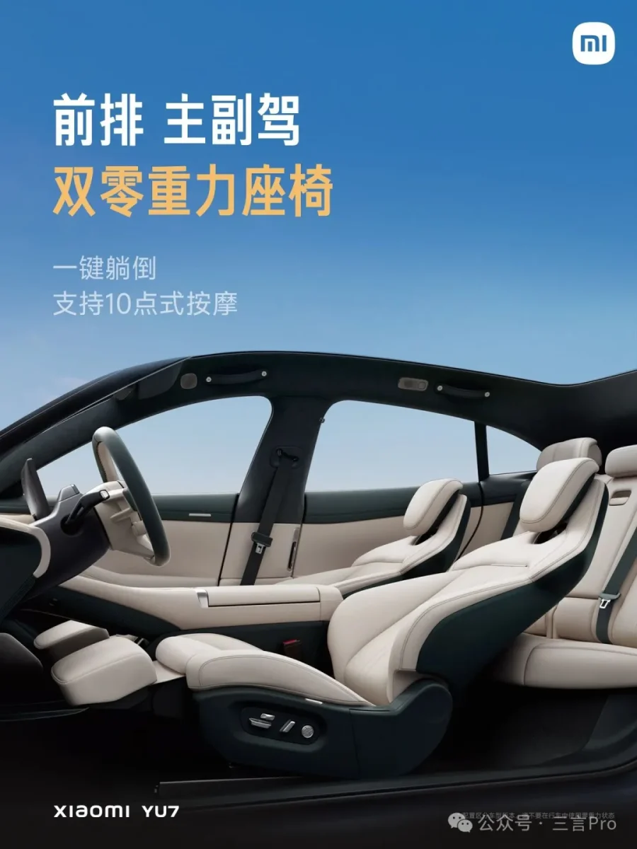 内饰上,YU7高频接触内饰面采用100%软包裹,使用Nappa真皮座椅。并且前排配有双零重力座椅,支持一键躺倒;后排135°电动座椅,配有三款内饰颜色。