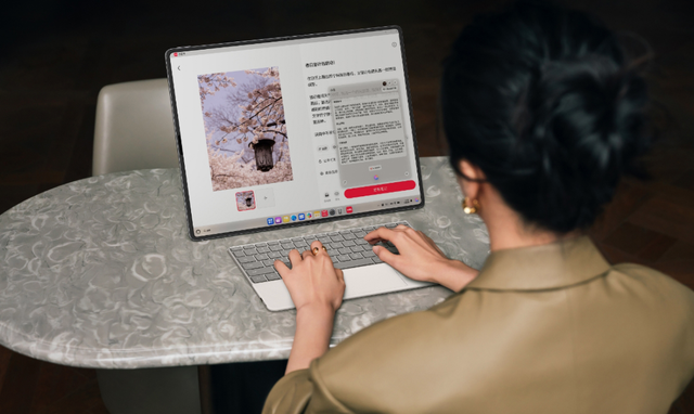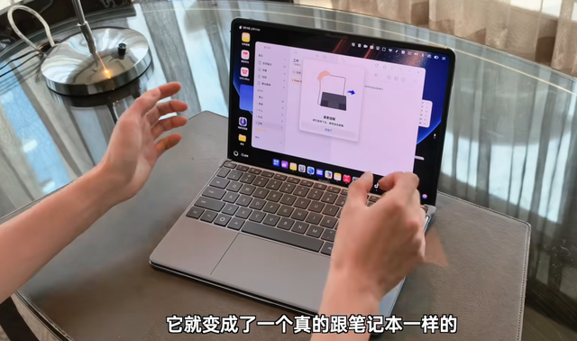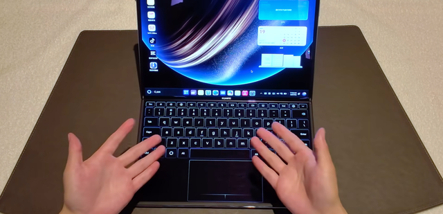 “折叠笔记本模式”下,华为MateBook Fold 非凡大师可以在屏幕的上半部分显示常规的系统内容,下半部分显示虚拟键盘,用户的手掌触摸按键时,有针对性的音效和震动,可以带来类似笔记本的操控体验。