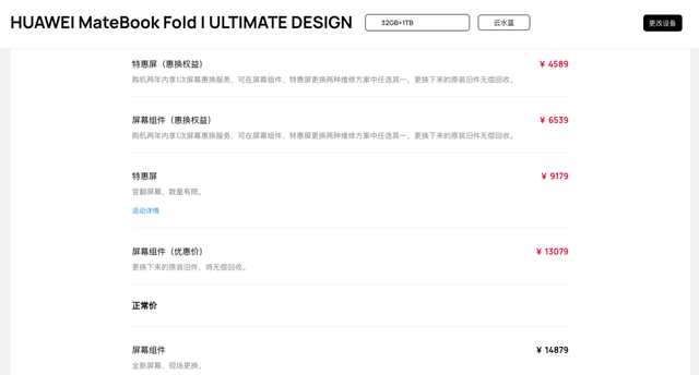 事实上,透过华为官方披露的MateBook Fold非凡大师的维修价格,也可以一窥该产品的上游成本之高。华为官网显示,32GB+1TB版华为MateBook Fold 非凡大师维修时,屏幕组件的正常价为14879元,即便现阶段有优惠价,也高达13079元。