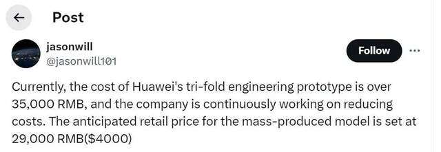 对此,余承东也在发布会上无奈地表示,“三折叠屏手机的成本非常高,希望后续通过工艺改进和良率提升,进一步降低成本。”