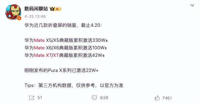 不过遗憾的是,由于价格高昂,华为Mate XT 非凡大师并未大规模出货,形成规模效应。2024年4月25日,数码博主“数码闲聊站”透露,Mate XT/XT典藏版累计激活量约为42万台,仅为Mate X6系列的一半左右。