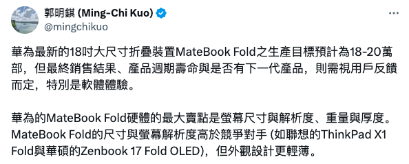 有鉴于华为MateBook Fold 非凡大师的价格更高,其销量或许也十分有限。5月20日,天风国际证券分析师郭明錤表示,华为Mate XT 非凡大师的生产目标预计为18-20万部,不足华为Mate XT 非凡大师累计销量的一半。