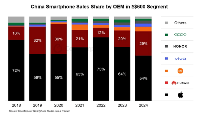 Counterpoint Research披露的数据显示,2024年,中国高端智能手机(定价600美元及以上,约合人民币4400元)市场,华为的市占率为29%,相较两年前扩大17个百分点,即将上涨至被制裁前的水平。