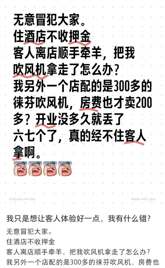 更离谱的是,不少羊毛党不仅想白嫖住宿和早餐,还想白嫖客房内的布草和备品。