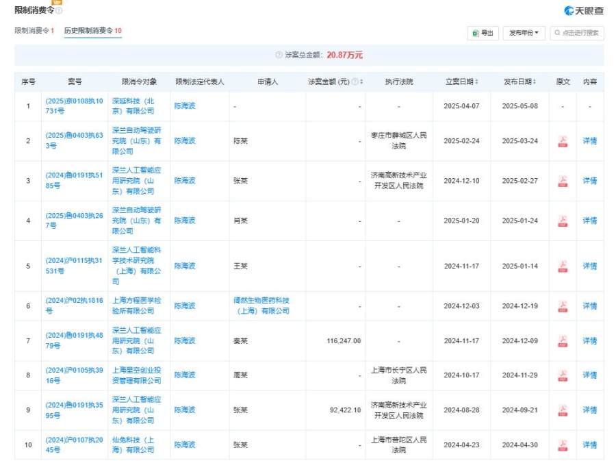 天眼查显示,深兰科技现存一条失信被执行人信息,四条被执行人信息,被执行总金额为1535.21万元,申请人不详。与此同时,其创始人、法定代表人陈海波也存在一条限制消费令,申请人孙某,立案日期为2025年3月14日。另外,陈海波还存在10条历史限制消费令,涉案总金额为20.87万元,申请时间从2024年4月30日延续至2025年5月8日,申请人多为个人。