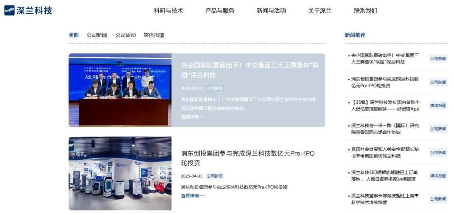 官网介绍,深兰科技创立于2014年,旗下多家公司,涉足智能驾驶、智能机器人、智能工业和智能医疗等领域。依托自主知识产权的计算机视觉、生物智能、自动驾驶、认知智能等核心技术,在众多世界计算机科学及人工智能领域顶级赛事上获得50余项冠军,被国家工信部授予专精特新“小巨人”企业称号。