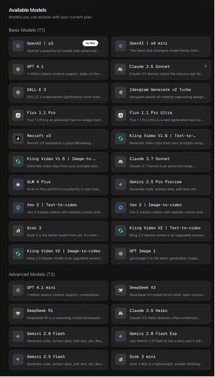 它们集成了市场上几乎所有主流的大模型,涵盖了几乎所有模态,例如Claude 3.7 Sonnet、Grok3、GPT Image1、Gemini 2.5 Pro preview、o3、o4 mini、DALL・E 3、Flux、Recraft和Kling等。