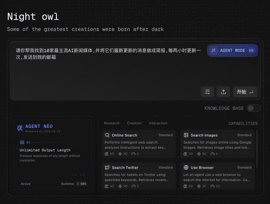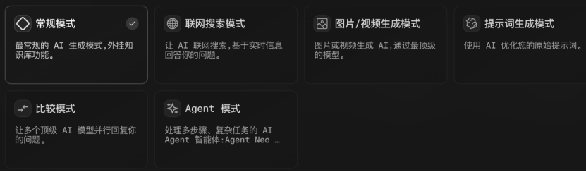 在Flowith产品官网中,如果点开输入框右上角的Agent Mode,则自动启用 Agent Neo,在此模式下,Neo可以智能调控各种大模型,完成长序列的复杂任务。